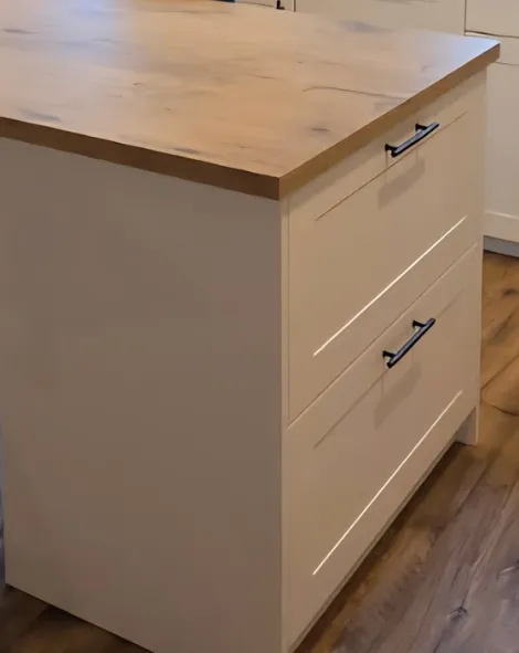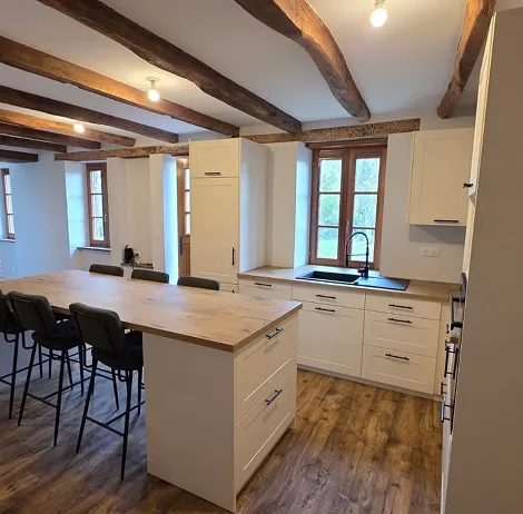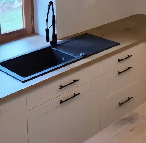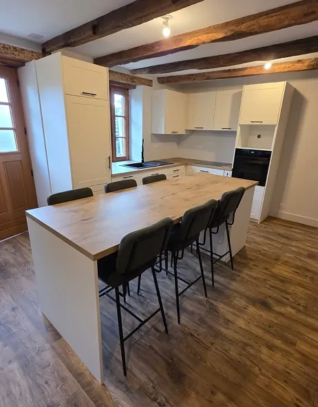 - Conception et pose de cuisines sur mesure (meubles, plans de travail, façades)